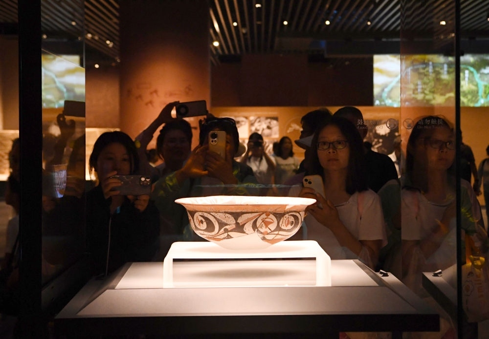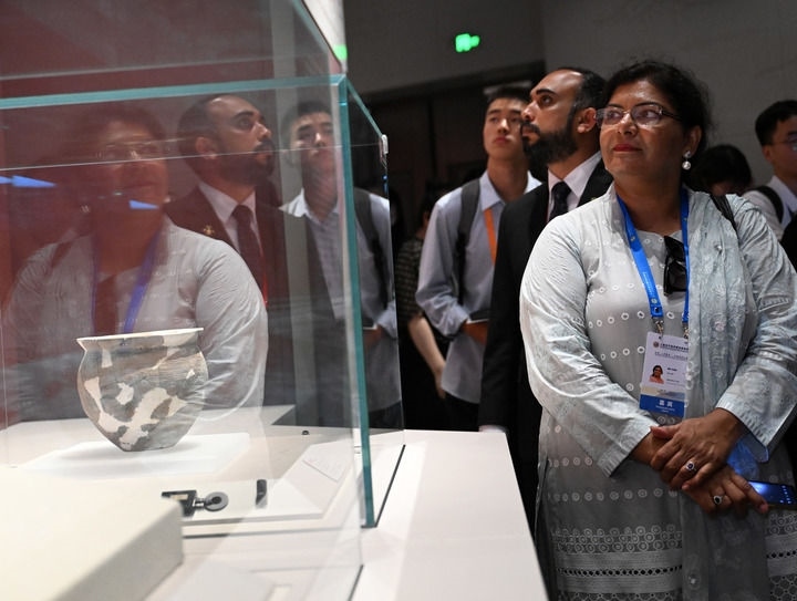 2025年7月24日,上海合作組織媒體智庫峰會子活動“文化遺產(chǎn)保護(hù)利用交流合作會”的參會嘉賓在鄭州大河村遺址博物館新館參觀。新華社記者 李嘉南 攝