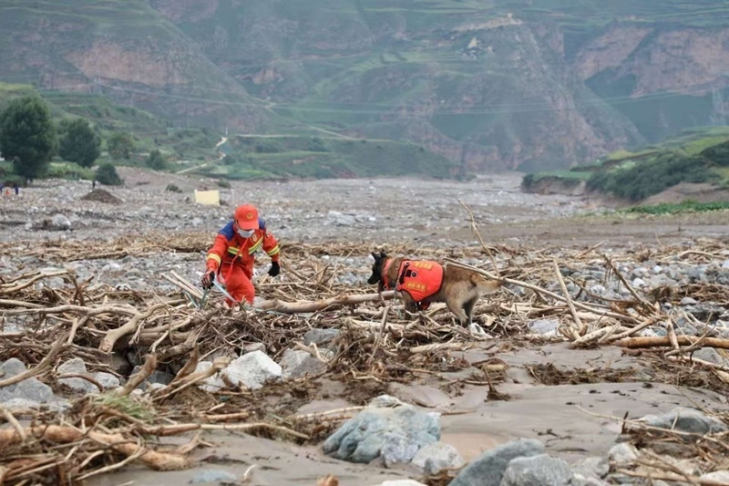 8月10日,在甘肅省榆中縣馬坡鄉(xiāng)馬蓮灘村,甘肅消防救援總隊(duì)指戰(zhàn)員攜帶搜救犬,利用專業(yè)裝備全力搜救失聯(lián)人員。