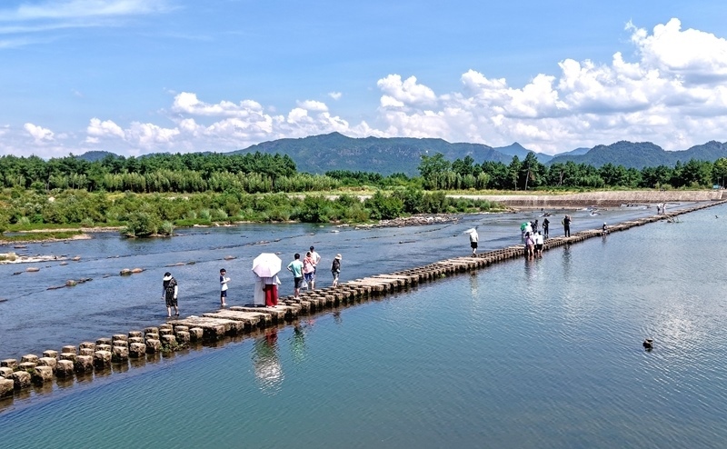 8月11日,游人在浙江省臺州市仙居縣永安溪白塔鎮(zhèn)段游玩(無人機照片)。