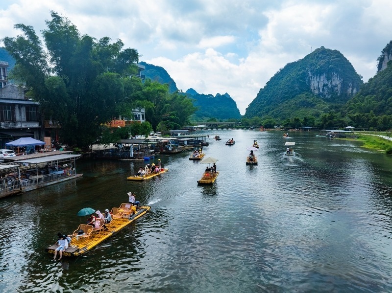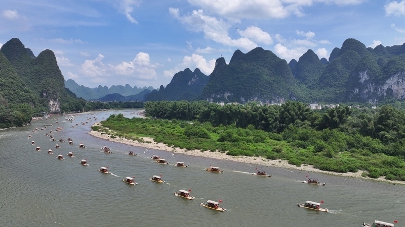 8月10日,在漓江廣西桂林市陽朔縣興坪鎮(zhèn)段,游客乘竹筏游玩賞景(無人機照片)。
