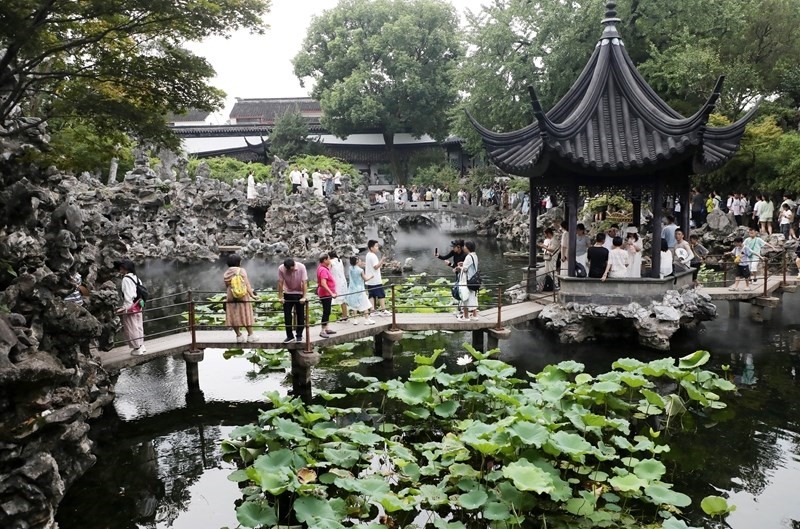 8月11日,游客在江蘇蘇州獅子林游玩。
