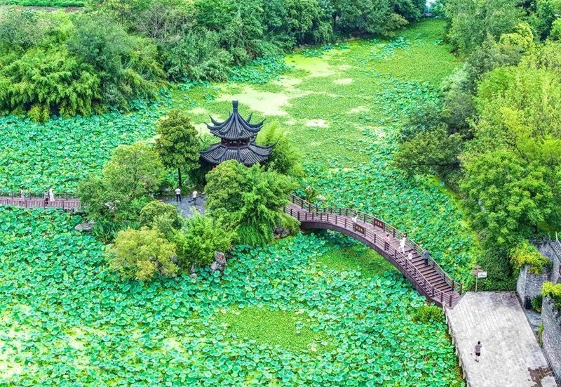 8月10日,游客在江蘇省揚州市江都區(qū)丁伙鎮(zhèn)樸園游玩(無人機照片)。