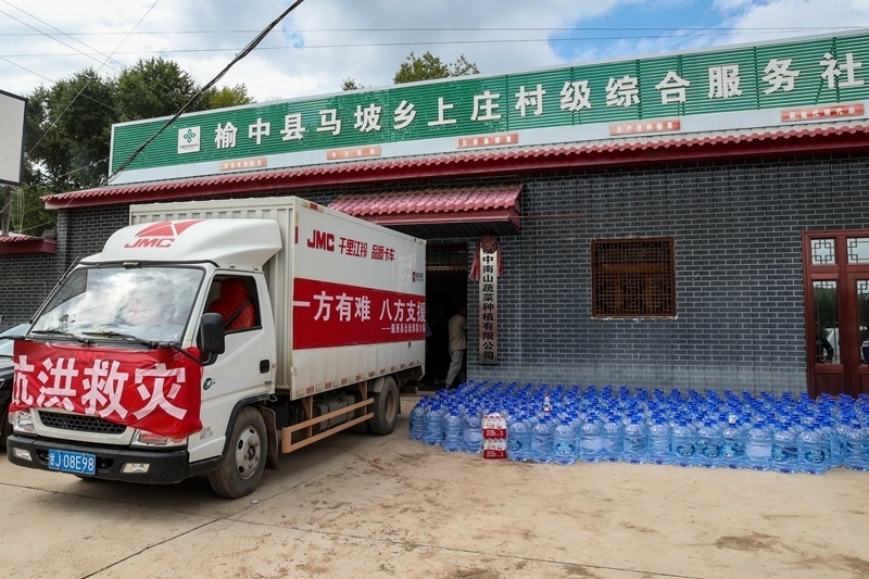 8月10日,一輛載著救援物資的車輛??吭谟苤锌h馬坡鄉(xiāng)上莊村臨時安置點。