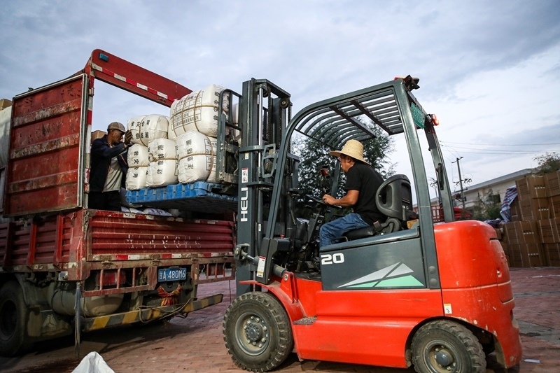 8月10日,在榆中縣救災物資儲備服務中心,工作人員將救災物資裝車。