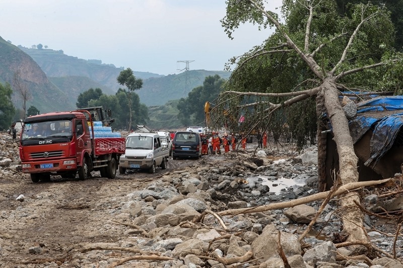 8月9日,在榆中縣馬坡鄉(xiāng)馬蓮灘村,救災車輛行駛在路上。