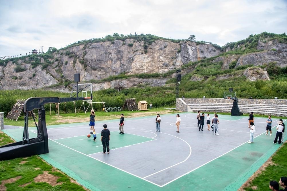 8月16日,在重慶市北碚區(qū)靜觀鎮(zhèn)中華村,游客在礦坑修復(fù)改造的運(yùn)動(dòng)場內(nèi)打球。新華社記者 唐奕 攝