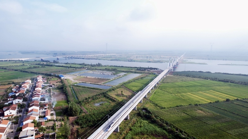 8月23日,試驗(yàn)列車(chē)通過(guò)襄荊高鐵宜城漢江特大橋(無(wú)人機(jī)照片)。