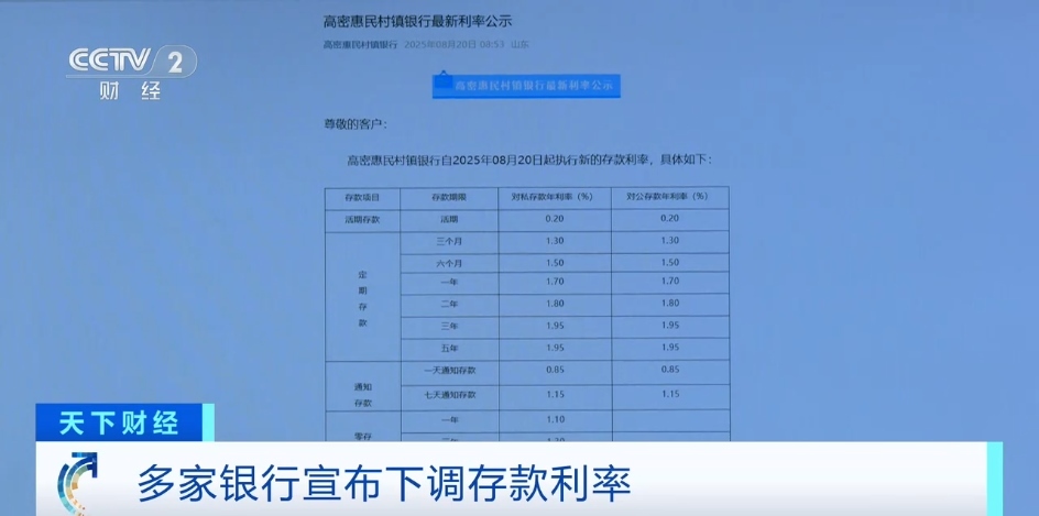8月20日,山東省高密惠民村鎮(zhèn)銀行公告,個人定期存款6個月、1年期、2年期的年利率均下調(diào)10個基點,3年期、5年期則下調(diào)20個基點。