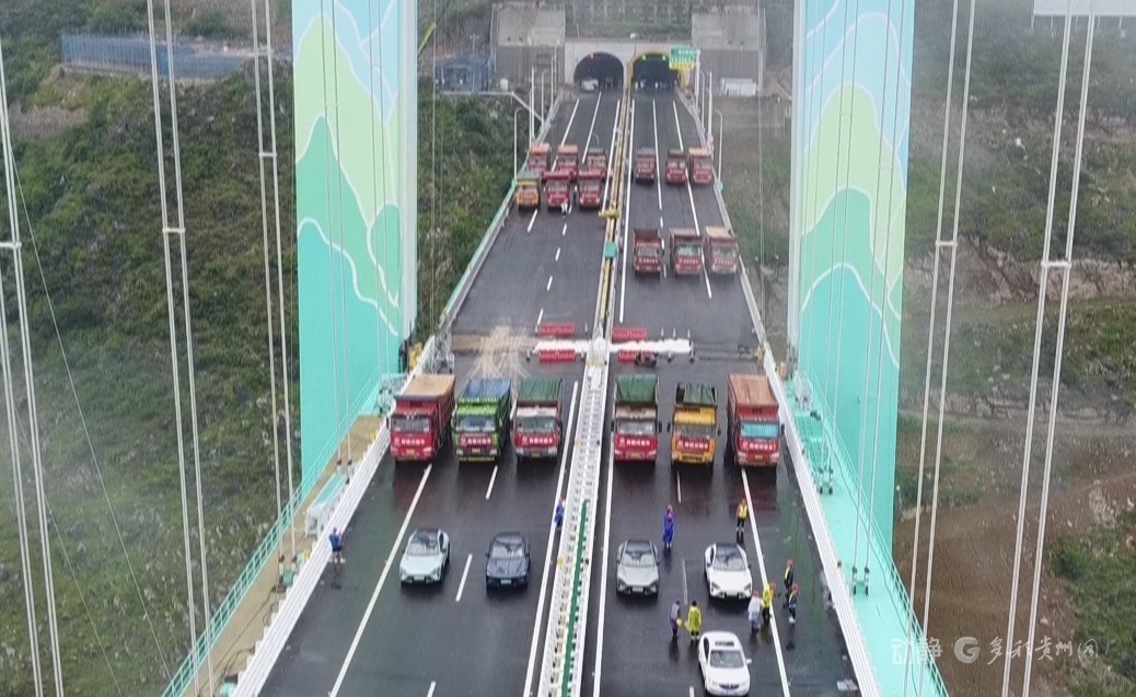 花江峽谷大橋啟動荷載試驗8月21日,隨著6輛35噸的三軸載重車率先駛上橋面,花江峽谷大橋荷載試驗正式啟動,迎來通車前的“關(guān)鍵大考”。
