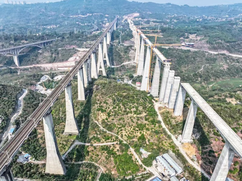 蔡家溝雙線特大橋位于重慶市涪陵區(qū),橫跨長(zhǎng)江支流,是全線重難點(diǎn)工程。大橋主跨采用連續(xù)剛構(gòu)設(shè)計(jì),整體呈“兩端短、中間長(zhǎng)”的對(duì)稱結(jié)構(gòu),總跨度達(dá)584米。