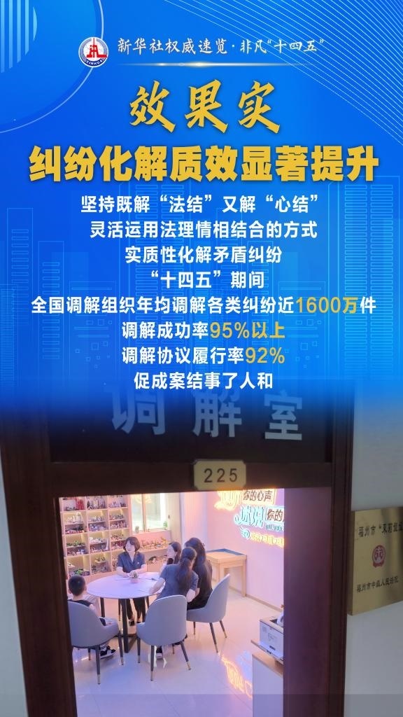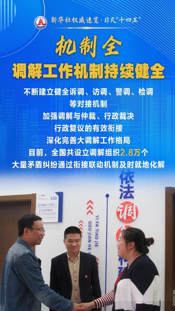 “十四五”期間,司法部堅持和發(fā)展新時代“楓橋經(jīng)驗”,充分發(fā)揮調(diào)解職能作用,以“機制全、領(lǐng)域廣、隊伍強、效果實”十二字為工作“秘訣”,大力加強矛盾糾紛排查化解,切實保障群眾合法權(quán)益,維護社會和諧穩(wěn)定。