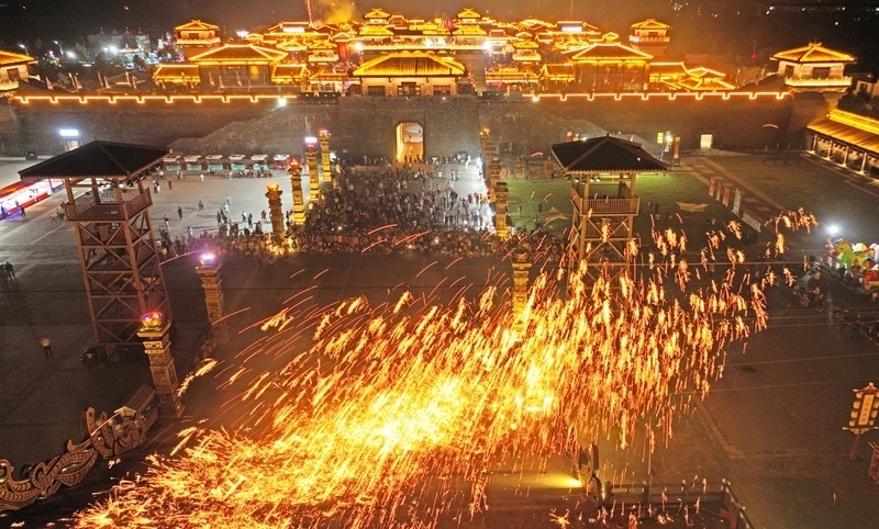 10月3日晚,游客在山東省臨沂市郯城縣郯國古城景區(qū)觀看打鐵花(無人機照片)。