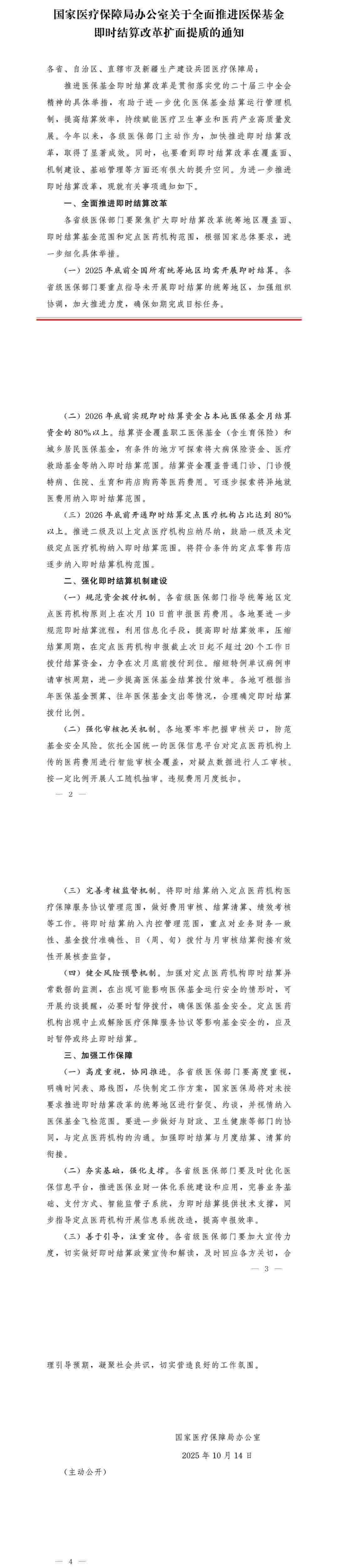 據國家醫(yī)保局官方微信消息,國家醫(yī)療保障局辦公室發(fā)布《關于全面推進醫(yī)保基金即時結算改革擴面提質的通知》。全文如下: