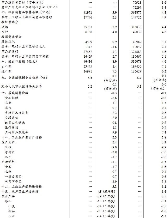前三季度,全國固定資產(chǎn)投資(不含農(nóng)戶)371535億元,同比下降0.5%;扣除房地產(chǎn)開發(fā)投資,全國固定資產(chǎn)投資增長3.0%。分領(lǐng)域看,基礎(chǔ)設(shè)施投資同比增長1.1%,制造業(yè)投資增長4.0%,房地產(chǎn)開發(fā)投資下降13.9%。全國新建商品房銷售面積65835萬平方米,同比下降5.5%;新建商品房銷售額63040億元,下降7.9%。分產(chǎn)業(yè)看,第一產(chǎn)業(yè)投資同比增長4.6%,第二產(chǎn)業(yè)投資增長6.3%,第三產(chǎn)業(yè)投資下降4.3%。民間投資同比下降3.1%;扣除房地產(chǎn)開發(fā)投資,民間投資增長2.1%。高技術(shù)產(chǎn)業(yè)中,信息服務(wù)業(yè),航空、航天器及設(shè)備制造業(yè),計算機及辦公設(shè)備制造業(yè)投資同比分別增長33.1%、20.6%、7.4%。9月份,固定資產(chǎn)投資(不含農(nóng)戶)環(huán)比下降0.07%。