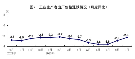 前三季度,全國工業(yè)生產(chǎn)者出廠價格同比下降2.8%。其中,9月份同比下降2.3%,降幅比上月收窄0.6個百分點,環(huán)比持平。前三季度,工業(yè)生產(chǎn)者購進價格同比下降3.2%。其中,9月份同比下降3.1%,降幅比上月收窄0.9個百分點,環(huán)比上漲0.1%。