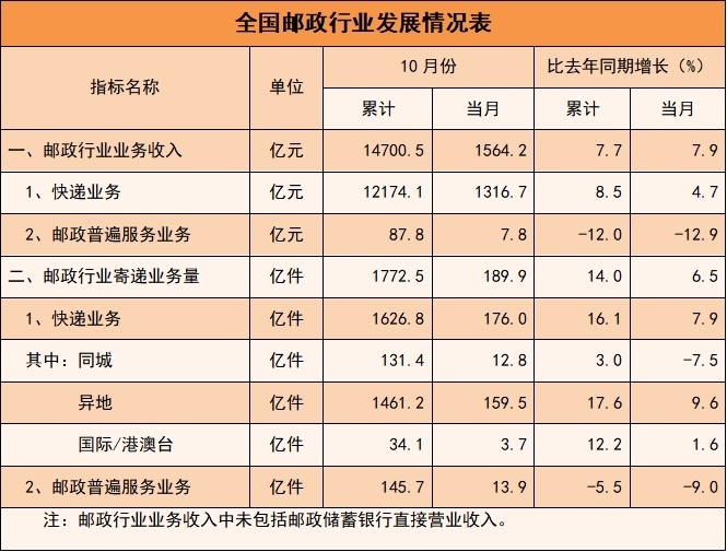 1—10月,郵政行業(yè)業(yè)務收入累計完成14700.5億元,同比增長7.7%。其中,快遞業(yè)務收入累計完成12174.1億元,同比增長8.5%。