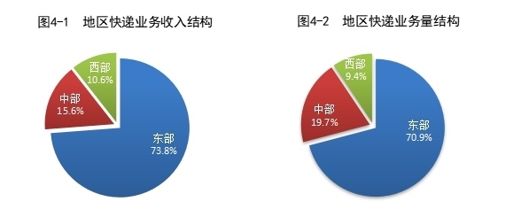 1—10月,東、中、西部地區(qū)快遞業(yè)務收入比重分別為73.8%、15.6%和10.6%,快遞業(yè)務量比重分別為70.9%、19.7%和9.4%。與去年同期相比,東部地區(qū)快遞業(yè)務收入比重下降0.9個百分點,快遞業(yè)務量比重下降1.7個百分點;中部地區(qū)快遞業(yè)務收入比重上升0.6個百分點,快遞業(yè)務量比重上升1.1個百分點;西部地區(qū)快遞業(yè)務收入比重上升0.3個百分點,快遞業(yè)務量比重上升0.6個百分點。
