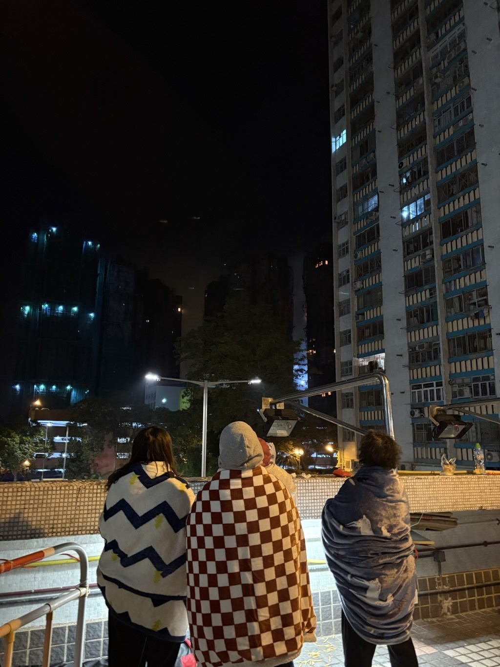 廣福商場二樓露天廣場,被疏散居民裹著毛毯觀望火勢