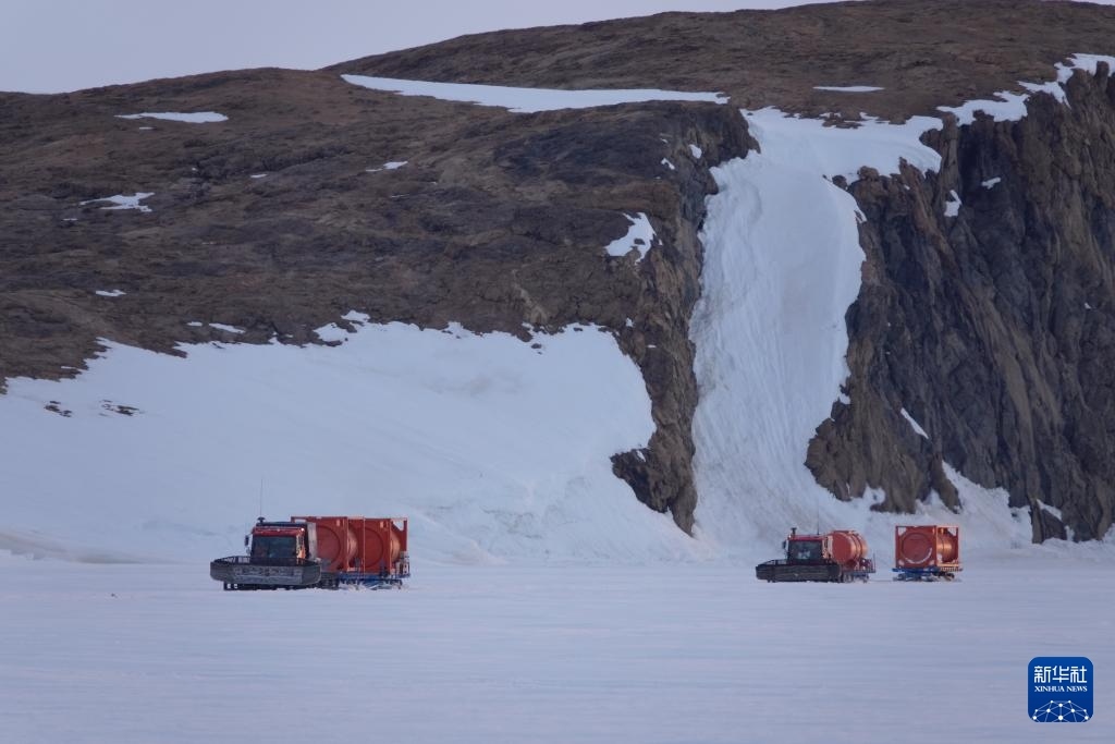 北京時(shí)間12月3日凌晨,從中山站和內(nèi)陸出發(fā)基地駛來的雪地車?yán)沼凸薜纸把?”號(hào)。新華社記者 顧天成 攝