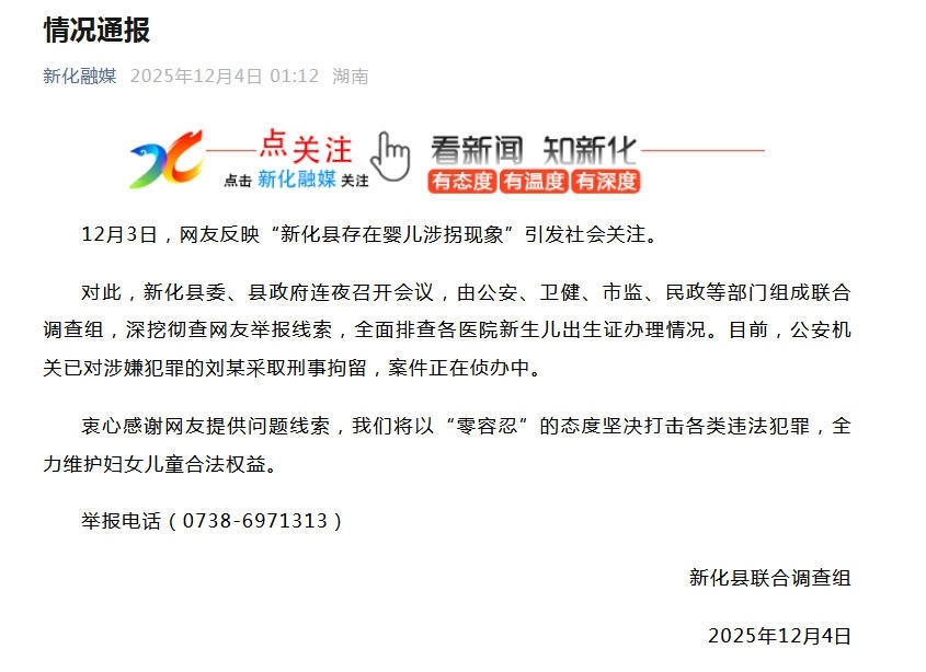 中新網12月4日電 針對網友反映的“新化縣存在嬰兒涉拐現(xiàn)象”,湖南省婁底市新化縣聯(lián)合調查組12月4日發(fā)布情況通報稱,新化縣委、縣政府連夜召開會議,由公安、衛(wèi)健、市監(jiān)、民政等部門組成聯(lián)合調查組,深挖徹查網友舉報線索,全面排查各醫(yī)院新生兒出生證辦理情況。