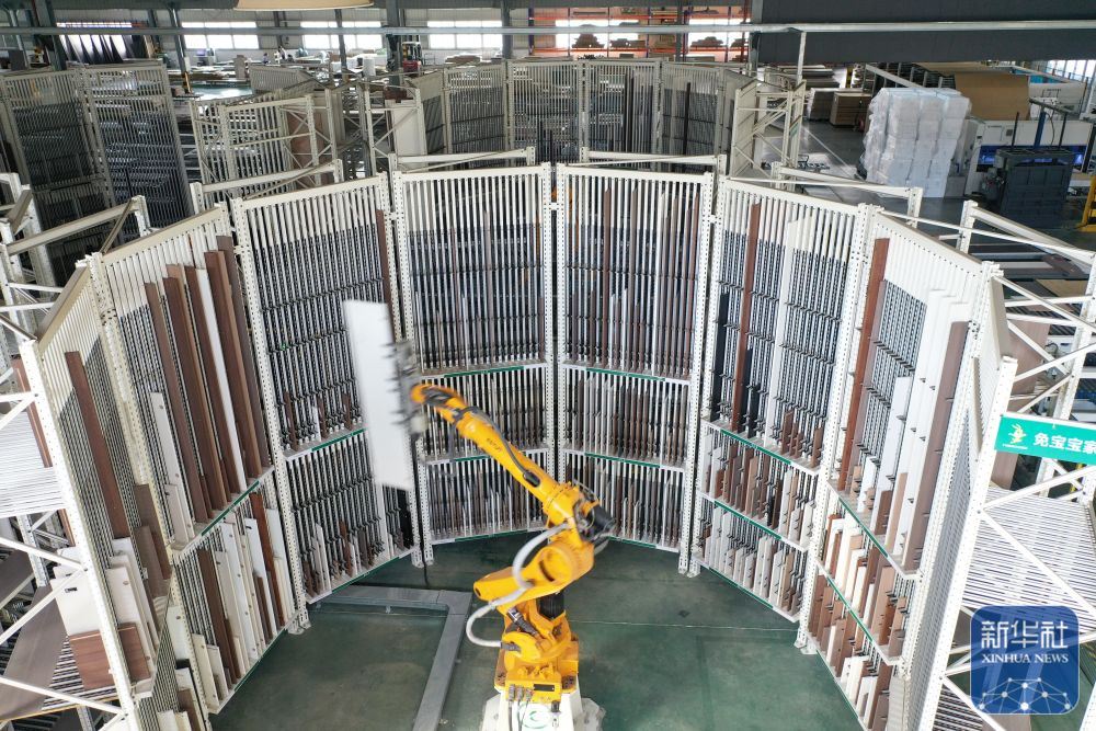 ↑ 12月15日,在位于浙江省湖州市德清縣乾元鎮(zhèn)的德華兔寶寶裝飾新材股份有限公司家居產(chǎn)業(yè)園,智能分揀機(jī)械臂在分揀家具板材(無人機(jī)照片)。新華社發(fā)(倪立芳攝)