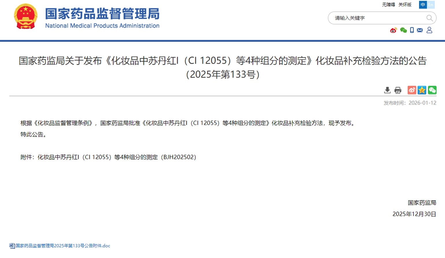 國家藥監(jiān)局發(fā)布化妝品中蘇丹紅的補充檢驗方法