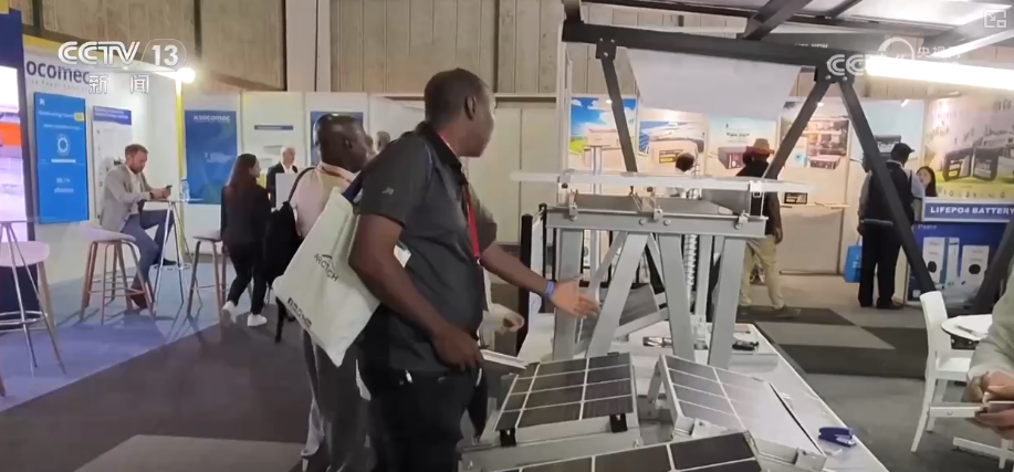 這個新能源產(chǎn)品可以說是非常具有非洲特色,它的上面是兩片光伏板,下面是兩個可以調(diào)整角度的攝像頭,用光伏發(fā)電來支持?jǐn)z像頭的運行,還有把路燈、攝像頭和光伏結(jié)合在一起的。