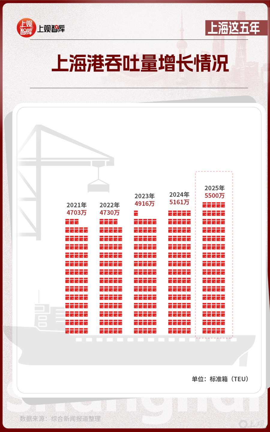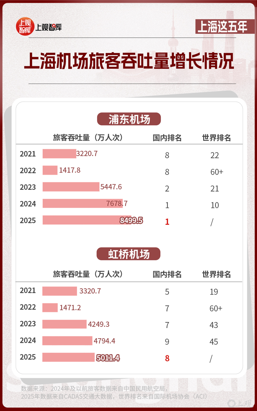 2024年,上海浦東國際機(jī)場(chǎng)首次排名全國旅客吞吐量第一,榮登中國最繁忙的機(jī)場(chǎng)。也是在這一年,上海港成為全球首個(gè)年吞吐量超過5000萬標(biāo)準(zhǔn)箱的世界大港。