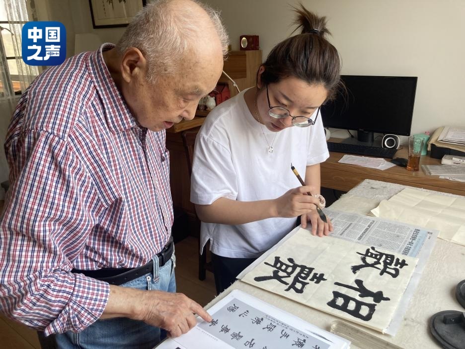陳真與周爺爺一起練習書法