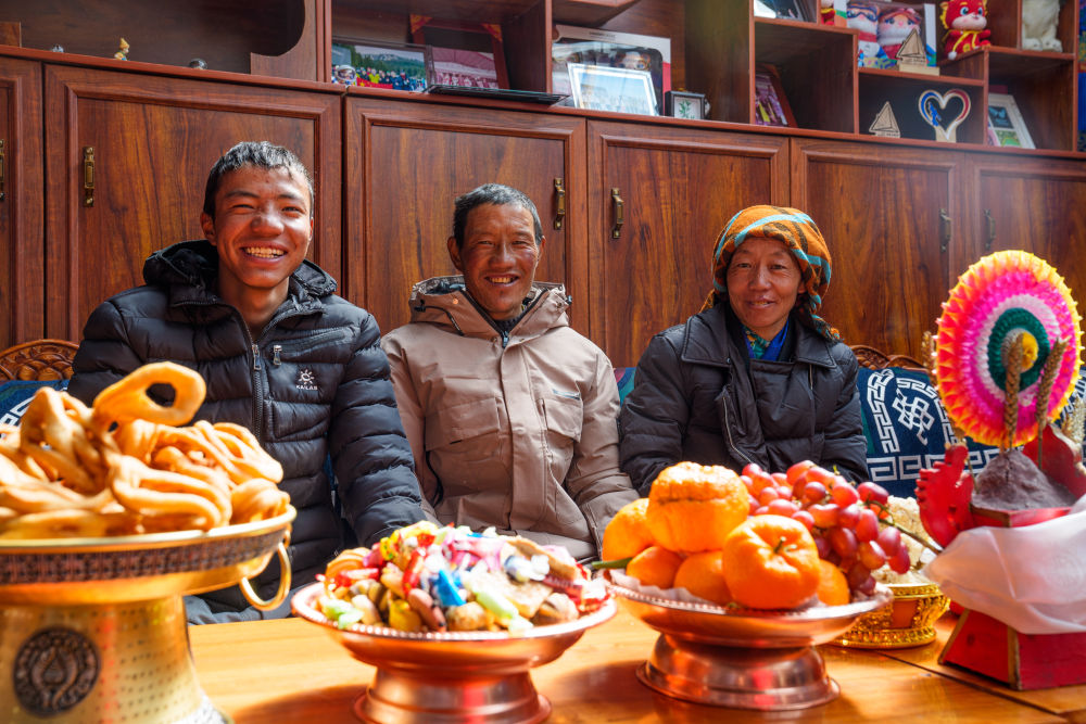 次旦玉珍的父親旦增群培(中)、母親德吉卓瑪(右)和弟弟達瓦頓珠坐在家中,背后的書架上擺放著許多次旦玉珍的參賽照片和參賽紀念品(2026年2月7日攝)。新華社記者 丁增尼達 攝
