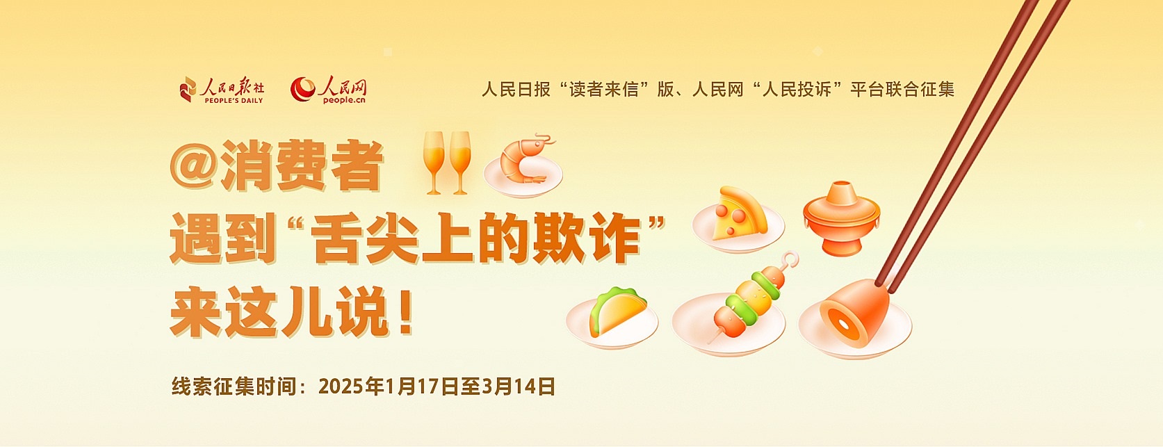 牛肉干里不含牛肉,無糖產(chǎn)品其實含糖,配料表造假、營養(yǎng)成分表不準確……你遇到過嗎?“以假亂真”“以次充好”為代表的食品欺詐,嚴重損害消費者利益,擾亂市場公平競爭秩序。為筑牢食品安全防線,增強消費者信心,即日起,人民日報“讀者來信”版與人民網(wǎng)“人民投訴”平臺聯(lián)合發(fā)起相關(guān)線索征集,歡迎您掃描上方海報二維碼進入征集頁面留言或提供調(diào)查線索至人民日報“讀者來信”版(郵箱:dzlx@peopledaily.cn 傳真:010-65368495)。線索征集時間截至2025年3月14日。