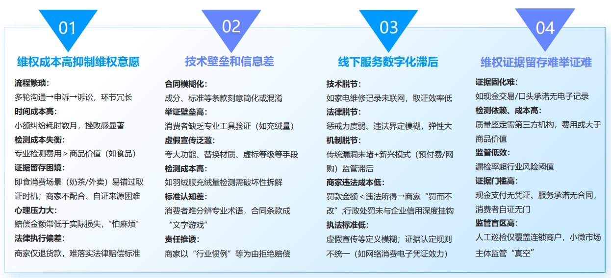 “人民投訴”分析認為,在傳統(tǒng)消費領域,消費者往往由于維權成本高、存在技術壁壘和信息差、線下服務標準不一、舉證難等原因使得維權難、維權慢、維權貴等現(xiàn)象始終未能有效減少。