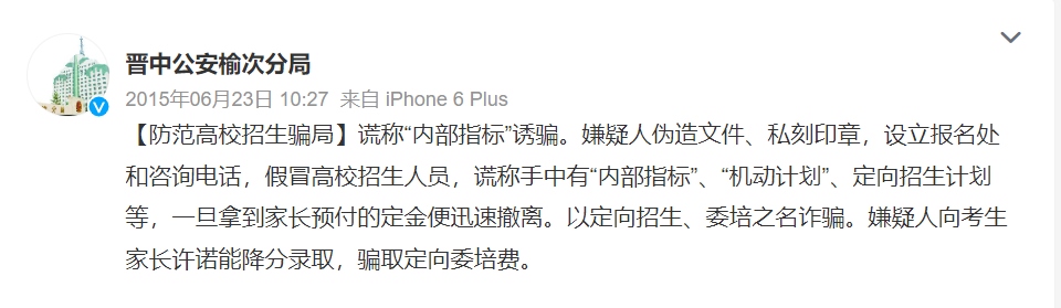 每年各省市投檔分?jǐn)?shù)線公布后,總是“幾家歡喜幾家愁”,不法分子也在此刻瞄準(zhǔn)了落榜考生。根據(jù)各地公安部門通報,一些不法分子假冒高校招生人員或聲稱“熟悉”高校招生辦,點(diǎn)對點(diǎn)與相關(guān)考生取得聯(lián)系。隨后謊稱有某高校的“內(nèi)部指標(biāo)”“機(jī)動計劃”,或是以“定向招生”“委培招生”等名義“降分錄取”考生,誘騙其繳納相關(guān)費(fèi)用。需要注意的是,在實(shí)施這些詐騙行為時,不法分子往往使用電腦合成技術(shù)偽造“招生文件”“學(xué)校公章”等,騙取考生及家長的信任。