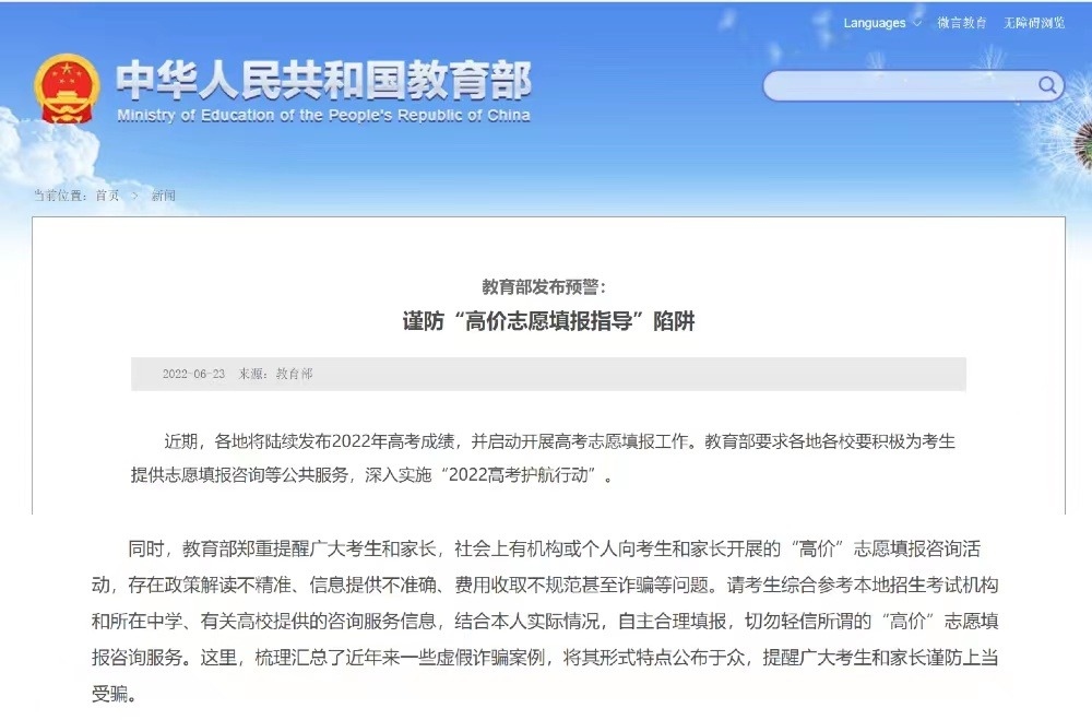 近日,教育部發(fā)布預(yù)警,提醒考生謹(jǐn)防“高價志愿填報指導(dǎo)”陷阱。有網(wǎng)站虛假宣傳擁有所謂“內(nèi)部信息”,自稱掌握內(nèi)部大數(shù)據(jù),能夠“精準(zhǔn)定位院?!钡鹊?。事實(shí)上,每年高考填報志愿前,各省級招生考試機(jī)構(gòu)都會發(fā)布當(dāng)年高考成績統(tǒng)計情況和近年來各高校錄取分?jǐn)?shù)情況,并不存在市面上的咨詢機(jī)構(gòu)或個人聲稱的“內(nèi)部信息”。還有一些咨詢機(jī)構(gòu)假冒所謂志愿填報專家身份。該咨詢機(jī)構(gòu)打出廣告,稱團(tuán)隊的專家“獲得高考志愿規(guī)劃師認(rèn)證”“來自著名高?!钡?。事實(shí)上,有關(guān)部門從未發(fā)放過“高考志愿規(guī)劃師”這類職業(yè)資格證書。該機(jī)構(gòu)一些所謂“志愿規(guī)劃師”都是臨時招募的社會人員,按照總部提供的“臺詞”給考生和家長輔導(dǎo)。家長購買這些機(jī)構(gòu)的服務(wù)不僅花了冤枉錢,而且可能報錯志愿。