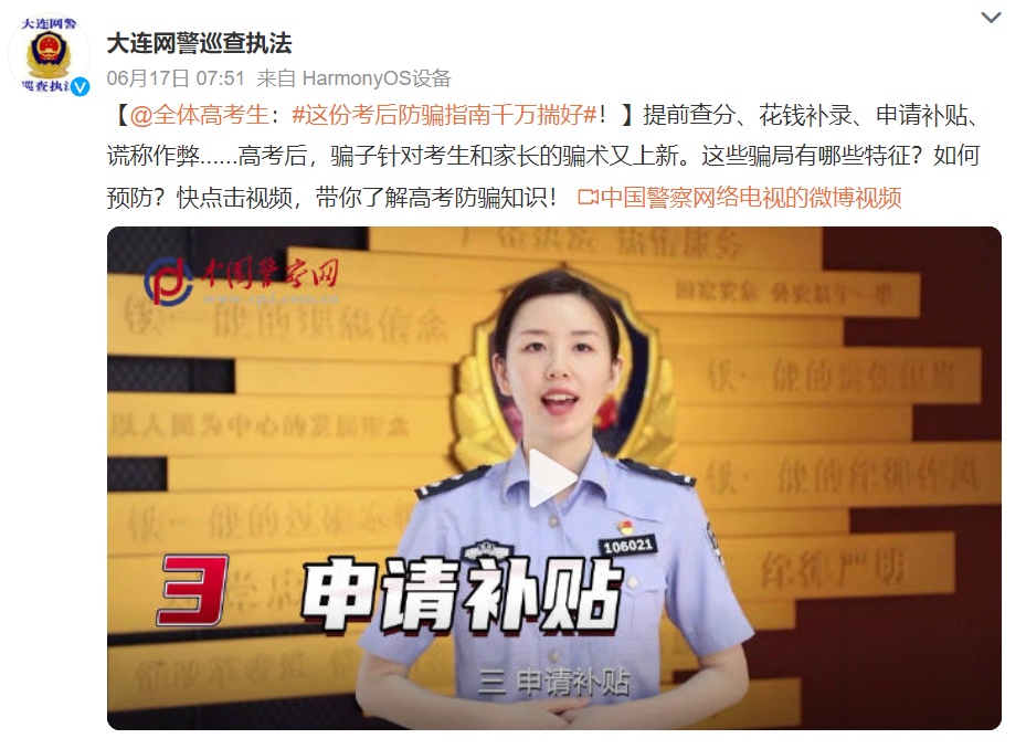 針對上述四種詐騙類型,廈門市打擊治理電信網(wǎng)絡(luò)新型違法犯罪中心民警洪恒亮表示,部分考生及家長“病急亂投醫(yī)”的焦慮心理和一些孩子希望盡早為家庭減輕經(jīng)濟(jì)負(fù)擔(dān)的迫切需求使得上述精準(zhǔn)詐騙得以有機(jī)可乘。不法分子通過看似專業(yè)的短信或電話通知,再輔以以假亂真的“證明材料”,具有一定的迷惑性。