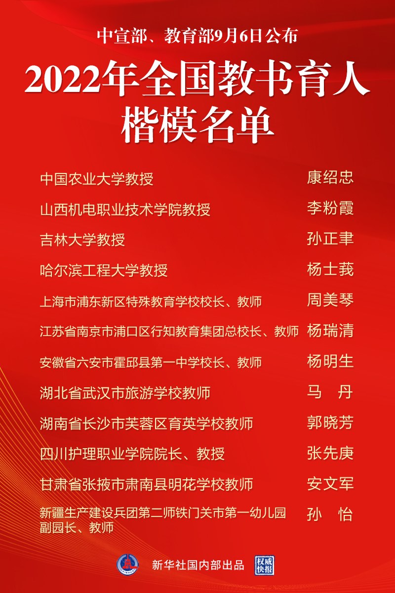 新華社北京9月6日電(記者徐壯)中宣部、教育部6日公布2022年全國教書育人楷模名單。12位全國教書育人楷模涵蓋了高教、職教、中小學(xué)、幼教、特教等各級(jí)各類教育,同時(shí)兼顧了地域、民族、性別、年齡等因素。