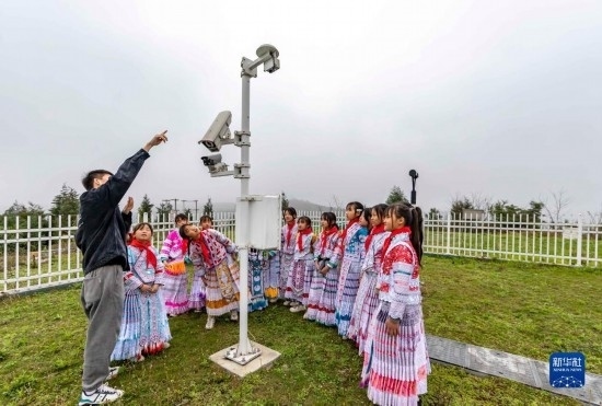 3月23日,學生在貴州省黔西市氣象局綜合氣象觀測站聽工作人員講解智能觀測儀工作原理。