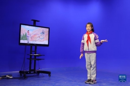 3月23日,一名學生在內蒙古自治區(qū)氣象局天氣預報演播室內體驗演播過程。