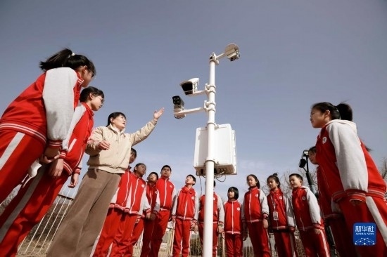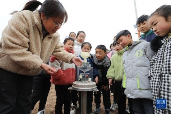 3月23日,在河北省遵化市氣象臺,工作人員為小學生介紹氣象觀測知識。