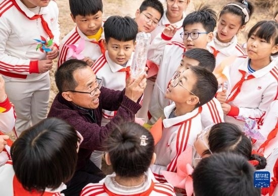 3月23日,在河北省唐山市豐南區(qū)氣象科普公園,工作人員和學生一起互動游戲。