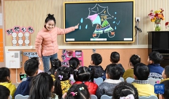 3月23日,河南省濟源市愚公路幼兒園的老師在課堂上為小朋友們講解雨水的形成過程。