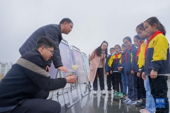 3月23日,貴州省黔東南苗族侗族自治州岑鞏縣氣象局工作人員為學生講解氣象知識。