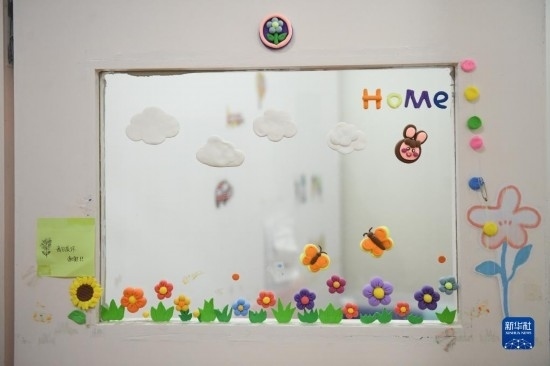 這是自閉癥青少年和老師一起裝扮的教室門(3月29日攝)。