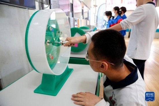 3月29日,中學生在校園流動科普巡展中體驗趣味科學裝置。