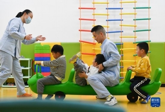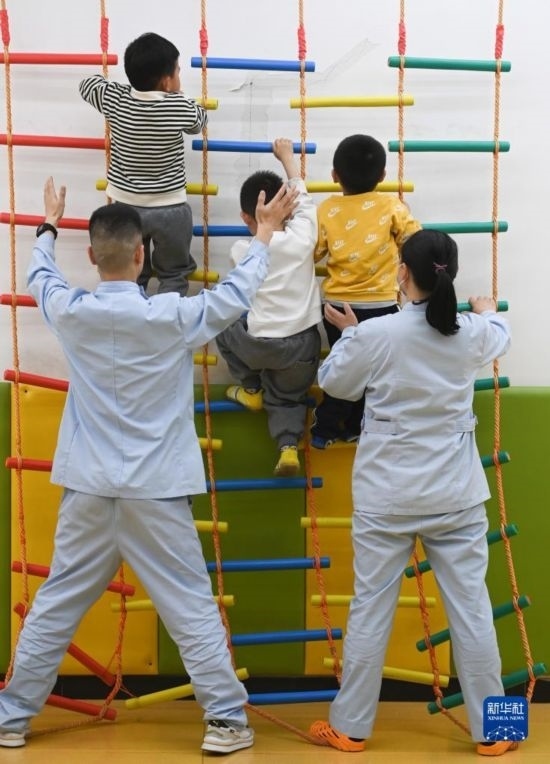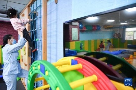 3月30日,在西安市金色陽光康復(fù)中心,孩子們在特教老師的保護(hù)下進(jìn)行康復(fù)訓(xùn)練。
