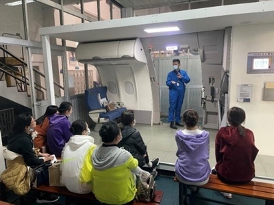 航空企業(yè)在實(shí)訓(xùn)基地組織實(shí)施空乘專(zhuān)業(yè)教師培訓(xùn)項(xiàng)目,此為參訓(xùn)教師學(xué)習(xí)正常與緊急情況開(kāi)關(guān)艙門(mén)的要領(lǐng)、機(jī)上應(yīng)急設(shè)備