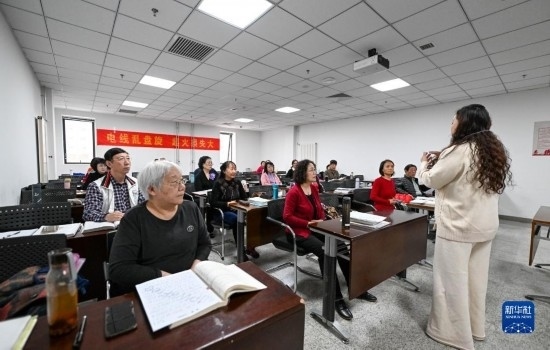 4月4日,在天津市河西區(qū)文化館,老人們?cè)谏箱撉僬n。