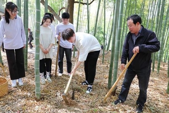 進(jìn)行40分鐘的“漫談式”課程后,師生們一起拿起鋤頭,開(kāi)始挖筍實(shí)踐。在勞動(dòng)中,他們感受著春天的饋贈(zèng)。該校視覺(jué)傳達(dá)與設(shè)計(jì)專業(yè)的南通姑娘周雨濛從未嘗試過(guò)挖筍。對(duì)于校園中的竹子是何人養(yǎng)護(hù)、怎么養(yǎng)護(hù),她了解得不多。課堂上,她第一次拿起鋤頭,在學(xué)校校工的帶領(lǐng)下挖筍。