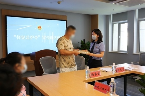 檢察官對(duì)失職家長送達(dá)督促監(jiān)護(hù)令。程珊/攝