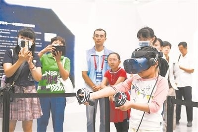 9月17日,在全國科普日北京主場活動展區(qū),小朋友使用虛擬現(xiàn)實設備感受天和核心艙內的生活。新華社記者 鞠煥宗攝